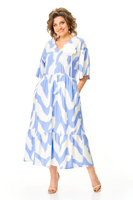 Платье женское А-образного силуэта со спущенной линией плеча. По окату рукава обработана сборка.Горловина V-образной формы. В среднем шве спинки застежка на тесьму-молнию. Перед и спинка выполнена последовательными оборками создающими легкое расклешение низу. В боковых швах обработаны карманы. В комплект входит съемная брошь в виде цветка.