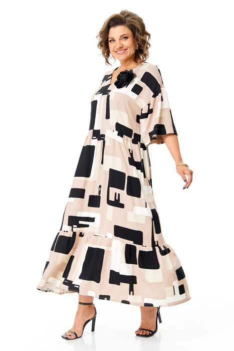 Платье женское А-образного силуэта со спущенной линией плеча. По окату рукава обработана сборка.Горловина V-образной формы. В среднем шве спинки застежка на тесьму-молнию. Перед и спинка выполнена последовательными оборками создающими легкое расклешение низу. В боковых швах обработаны карманы. В комплект входит съемная брошь в виде цветка.