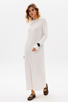 Платье прилегающего силуэта, с округлой формой горловины с ассиметричным подрезом по талии и небольшим напуском. Рукав в платье ассиметричный (левый-цельнокроеный, правый со спущенный проймой через подрез по лифу платья). От подреза притачная баска, юбка платья прямая с разрезом в боковом шве. В боковом шве платья застёжка на тесьму-молнию.Длина платья 135 см. Длина рукава левого 39 см (р.50-54), 40 см (р.56-60). Длина рукава правого 52 см  (р.50-54), 53 см (р.56-60)