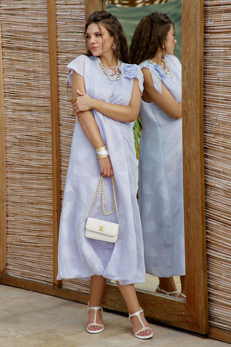 Это платье для тех, кто верит в магию повседневности и умеет находить поэзию в обычных летних днях. Оно создано для мечтательниц, фантазерок и всех, кто помнит, что иногда достаточно надеть правильное платье, чтобы день превратился в сказку. Сиреневый оттенок — это сложная гамма, меняющаяся подобно небу на рассвете: при прямом свете — нежно-лиловый с голубоватым подтоном, в тени — приглушенный фиалковый с сероватым отливом. Полупрозрачный материал, создающий эффект дымки.  Ткань пропускает свет, но сохраняет приватность, при движении образует мягкие складки и волны. Фактурный принт — главная особенность ткани, создающая объемную иллюзию. При определенном угле зрения узор "оживает".  Платье имеет небольшое прилегание расширяясь к низу. Верхний слой платья по низу закладывается в складки и «заболонивается» на подкладку. Форма баллона создает ощущение воздушности. Горловина в платье имеет ассиметричный фигурный вырез. По переду и спинке платья вертикальные рельефы от плечевых швов до низа, на уровне талии застрачиваясь в неглубокие складки. Линия плеч в платье ассиметричная, пройма углублена. В боковом шве платья застёжка на потайную тесьму-молнию. Съёмная брошь-роза — изысканный акцент, выполненный из той же ткани. Она добавляет в образ романтические нотки. Платье на подкладке. Длина платья 132 см, длина рукава 22/14 см (р 50-54), 22,5/14,5 см (р 56-60).
