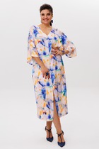 Описание: Приталенный силуэт, короткий рукав реглан, круглая горловина, на передней полочки планака с пуговкой, в боковых подрезах карманы, длина до середины голени.