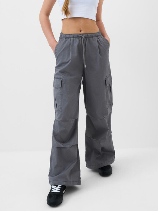 Брюки карго для девочки подростка. Выполнены из плотного хлопкового твилла. Модель имеет заниженную посадку и свободный крой с утяжками внизу, которые позволяют регулировать ширину брючин. Пояс на резинке с дополнительной регулировкой шнуром. На бедрах расположены накладные карманы на липучке, а также боковые карманы.
