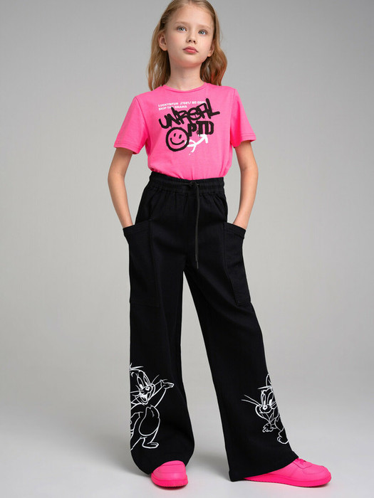 Джинсы для девочки подростка. Джинсы из сверхудобного эластичного материала Loop Denim. Loop denim имеет внешний вид классической джинсы, а по тактильным ощущениям мягкий и комфортный, как трикотаж. WIDE LEG - свободная посадка и расклёшенные от бедра штанины. Высокая посадка. Джинсы на резинке со шнурком. Накладные карманы. Контрастный лицензионный принт. Модель выполнена из качественного и плотного текстиля.