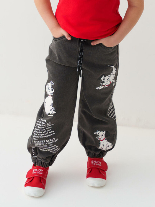 Джинсы детские с ярким дизайном "101 далматинец" для девочки. Модель свободного кроя, с удобной посадкой на резинке и декоративными завязками. Низ штанин собран на резинку, что добавляет изделию комфорта и стиля. Украшены крупными принтами с персонажами мультфильма и газетными надписями, включая яркий элемент "101" на заднем кармане.