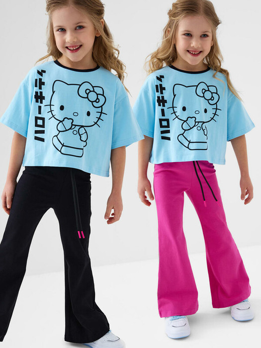 Детские брюки клеш для девочки. Комплект из 2 пар выполнен из хлопкового трикотажа джерси. Средняя посадка на талии. Пояс на резинке, дополнительно регулируется шнурком.