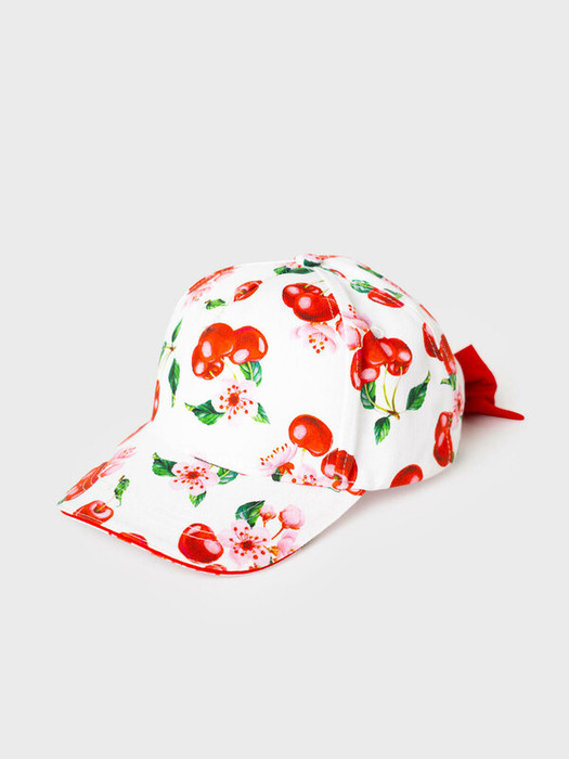 Лёгкая и яркая детская бейсболка для девочки. Выполнена из хлопкового текстиля с красочным принтом: вишни, листья и цветы. Козырёк изогнутый. Сзади — мягкая эластичная резинка, скрытая эффектной красной лентой с бантом. Есть вышитые вентиляционные отверстия.