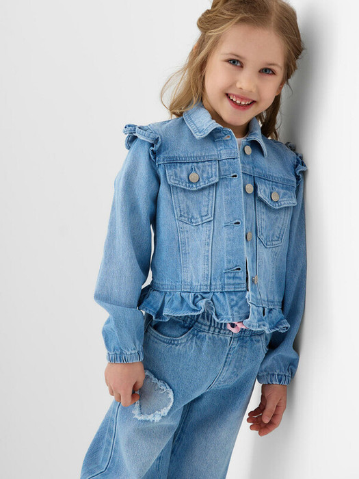 Детская джинсовая куртка для девочки. Модель выполнена из плотного светлого денима и украшена милыми деталями. Классический воротник, длинные рукава на резинке и удобная застежка на металлические кнопки. Впереди есть два нагрудных кармана. Особенности дизайна — декоративные воланы по плечам и оборка по низу изделия, что придаёт модели нарядный и нежный вид.