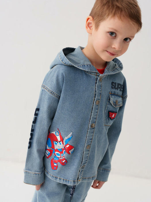 Детская джинсовая оверсайз куртка-рубашка с капюшоном для мальчика. Модель выполнена из светло-голубого денима. Свободный крой, застежка на кнопки. На груди — накладной карман. В оформлении использованы яркие принты. Сзади — декоративные стрелки.