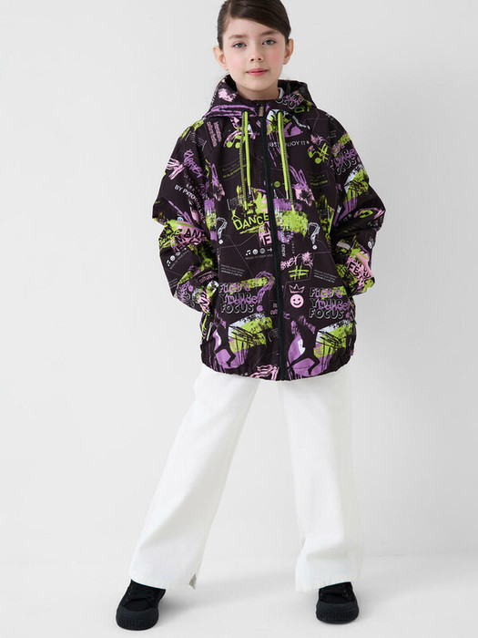 Cтильная ветровка для девочки подростка. Температурный режим от +20С до +10С. Ткань с мембранным покрытием 5000х5000. Внутри мягкая подкладка из трикотажа. Капюшон несъемный, регулируется шнуром. Два боковых кармана на молнии. Внутренний карман на липучке. Манжеты и низ изделия собраны на резинку. На спинке снизу — светоотражающая нашивка для безопасности в тёмное время суток.