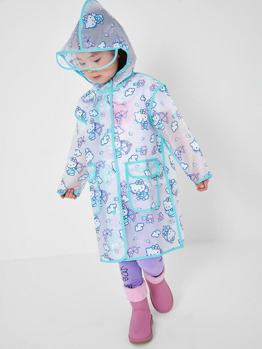 Дождевик детский с HELLO KITTY для девочки. Модель с козырьком. Застежка на кнопки. Материал ЭВА. Без подкладки. Модель имеет спереди два накладных кармана с клапаном. Сзади заложена широкая складка с клапаном с кнопкой на уровне талии для изменения объема плаща. Есть светоотражающие элементы спереди и сзади. Добавлена петелька под капюшоном с внешней стороны, чтобы остальные вещи на вешалке не намокали. Модель идеально сочетается с резиновыми сапогами и зонтом из коллекции. В комплекте идет непромокаемая сумочка.