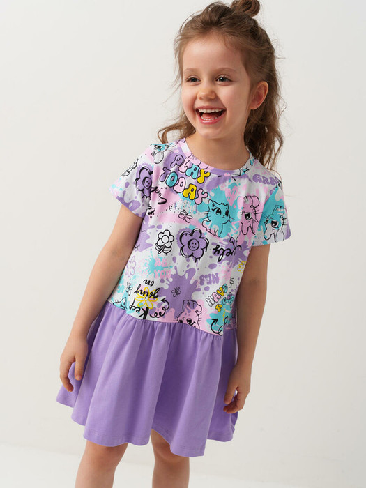Детское платье для девочки. Модель с короткими рукавами, укороченной длины — выше колена. Выполнено из мягкого хлопкового трикотажа джерси. Верхняя часть прямая, юбка со сборками создает легкий объем. Украшено яркими принтами с милыми животными.