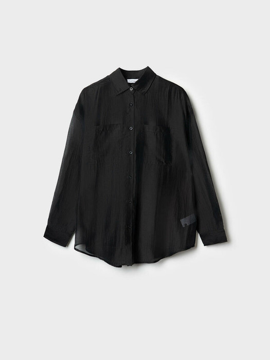Женская рубашка. Модель свободного кроя с длинным рукавом. Выполнена из лёгкой и полупрозрачной ткани, что придаёт образу воздушность. У рубашки классический воротник, застёжка на пуговицы и два нагрудных накладных кармана. Рукава с манжетами на пуговицах.