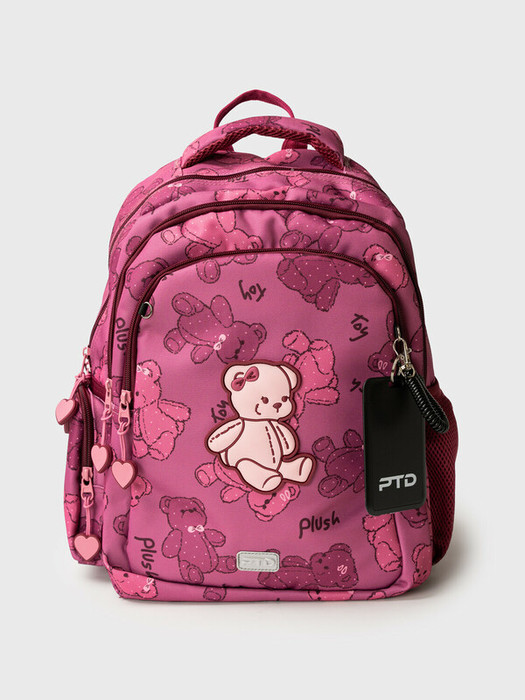 Трехсекционный рюкзак с ортопедической спинкой для девочки школьницы. Конструкция ортопедической вентилируемой спинки обеспечивает максимальный комфорт и позволяет снизить нагрузку на спину школьников и дошкольников. Широкие мягкие  вентилируемые лямки регулируются по высоте, что делает рюкзак идеальным как для первоклассника, так и для детей из средней школы. Спереди лямки можно закрепить на застежку, чтобы они не спадали. Дно имеет уплотнительный вкладыш, который при необходимости можно не использовать. Снизу дна имеются резиновые "ножки", чтобы низ рюкзака не пачкался. Рюкзак имеет два основных отделения на молнии один большой карман спереди. Внутри имеется несколько отделений и кармашков для систематизации школьных принадлежностей. По бокам есть карманы: один - сетчатый, второй - на молнии.  У рюкзака есть две ручки: одна - мягкая вентилируемая ручка для ношения в руках, вторая маленькая - для того, чтобы рюкзак можно было вешать на вешалку. Модель выполнена из водонепроницаемой ткани. Ранец имеет светоотражающие детали на лямках, по бокам, на переднем отделении, чтобы ребенка было хорошо видно в темноте со всех сторон. В подарок идет пластиковый чехол для пропуска на растягивающейся пружине. Пружина дает возможность спокойно приложить пропуск к турникету не снимая рюкзак. Ранец декорирован милым патчем Мишкой. Рюкзак в школу можно дополнить мешком для обуви и пеналом в том же дизайне. Размер рюкзака: 29*38*19 см. Вес рюкзака: 650 гр