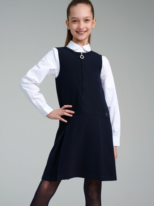 Школьный текстильный сарафан для девочки подростка. Синее платье свободного силуэта идеально подойдет для гардероба в школу. Сарафан для школы выполнен из ткани с технологией non-iron, которая не требует глажки после стирки. Полочка на молнии.