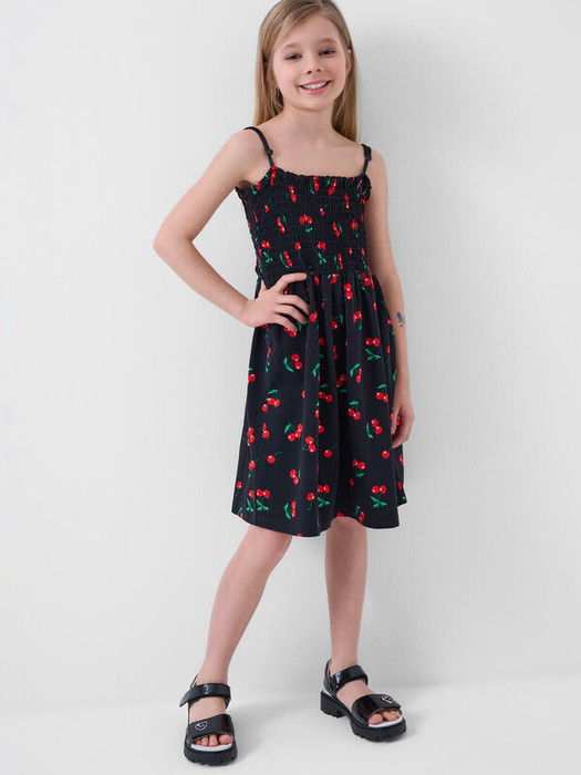 Летний сарафан для девочки подростка. Выполнен из хлопкового трикотажа джерси. Модель средней длины - чуть выше колена, с открытыми плечами и регулируемыми бретелями. Верхняя часть платья выполнена с эластичной сборкой, которая обеспечивает комфортную посадку по фигуре. Юбка слегка расширяется и присборена, создавая лёгкий силуэт. Низ оформлен аккуратной подгибкой. Яркий принт с вишнями.