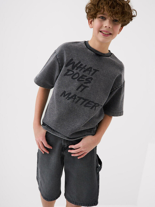 Джинсовые шорты свободного кроя, ниже колена для мальчика подростка. Они выполнены из плотного денима и дополнены множеством практичных деталей: классические передние карманы, задние накладные карманы и дополнительный карго-карман сбоку. Пояс регулируется при помощи внутренней резинки с пуговицей, а в качестве застёжки используется болт и молния. Шорты смотрятся современно и удобно сидят за счёт прямого силуэта и проработанных деталей.