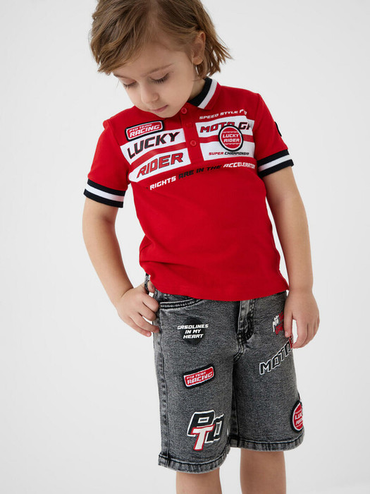 Детские джинсовые шорты прямого силуэта для мальчика. Застежка на молнию и болт. Удобные боковые и задние карманы. Украшены яркими принтами в стиле мотоспорта. Низ шорт оформлен подворотами.