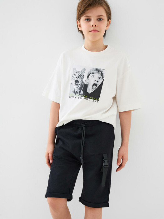 Шорты для мальчика подростка. Модель свободного кроя из мягкого, хлопкового трикотажа футер. Удобная посадка обеспечивается эластичным поясом со шнуром. Спереди — диагональный декоративный шов, боковые карманы и стильная лента с пряжкой на правой штанине.
