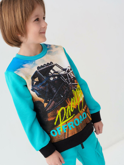 Свитшот детский для мальчика. Выполнен из хлопкового футера без начеса. Модель прямого кроя. Спереди — красочный принт, вдохновленный тематикой мотоспорта. Манжеты и низ изделия выполнены из эластичного риба, что обеспечивает комфортную посадку. На рукаве — яркая нашивка.
