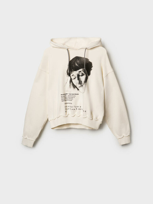 Женское худи оверсайз. Выполнена из хлопкового футера без начеса. Капюшон регулируется шнуром. На груди — портрет Анны Ахматовой, выполненный художником Николаем Тырсой в 1928 году. Низ изделия и рукава оформлены эластичными резинками. Модель укороченная, длиной до бедер.