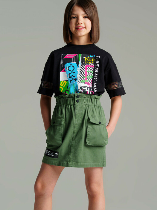 Юбка из твила для девочки. Застежка на пуговицу, пояс с внутренней утяжкой. Функциональные накладные карманы.