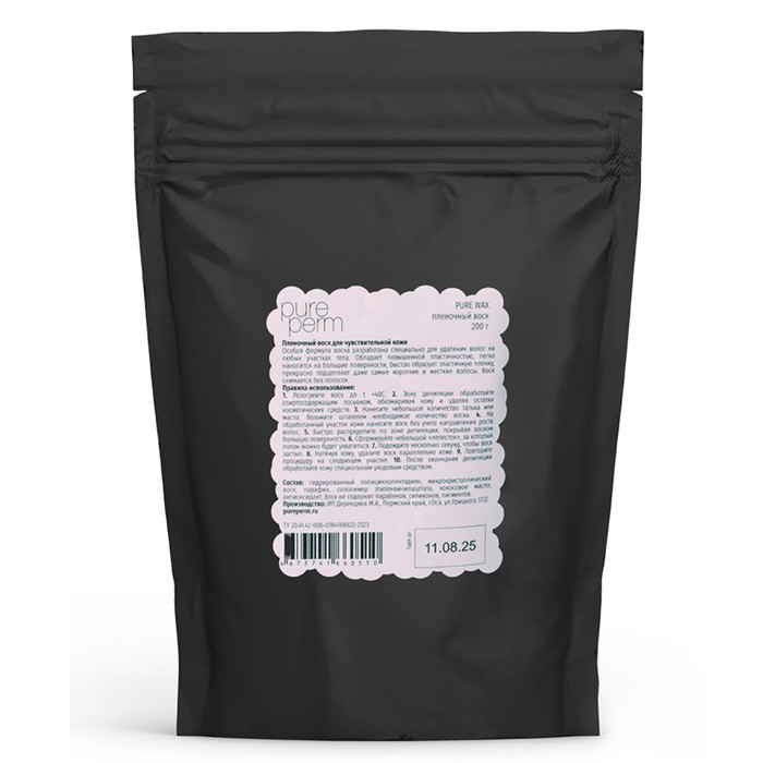 Тип: Воск для депиляции Вес: 200 г Срок годности: 24 мес. Условия хранения: Условия хранения- хранить при t от +5°С до +25°С, в сухом, в защищенном от света и недоступном для детей месте Страна изготовитель: Россия Торговая марка: Pure Wax Изготовитель: ИП Дерендяев Максим Алексеевич Свидетельство о государственной регистрации: RU.08.08.09.001.R.002126.09.23 Технические условия: ТУ 20.41.42-006-0184188822-2023Пленочный воск для чувствительной кожи