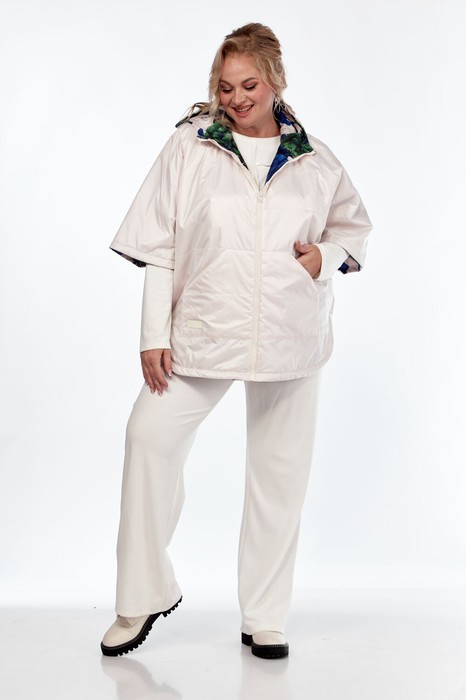 Пончо 2-ух стороннее с центральной бортовой застежкой "молния". Черная сторона: по переду и спинке выполнена горизонтальная стежка. Перед с накладными карманами "кенгуру". Вторая сторона: перед с боковыми прорезными карманами "с листочкой". По боковым швам застежка на три кнопки образует разрезы округлой формы. Воротник-капюшон. По краю отделочная строчка на 2,5 см.