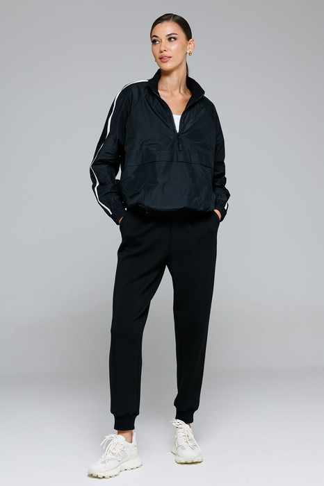 Брюки спортивные, зауженные к низу и по низу планка из довяза. Брюки с притачным, отстрочным поясом на резинке и втянутым в него декоративным шнуром. По переду брюки с карманами.