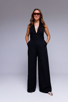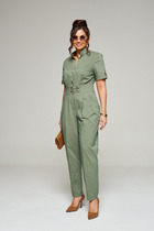 Комбинезон полуприлегающего силуэта. Комбинезон отрезной по линии талии. лиф спинки со средним швом, в котором обработана застежка на потайную тесьму-«молнию». Лиф переда с талиевыми вытачками. Брюки длинные, широкие. По задним половинам брюк талиевые вытачки. Комбинезон выполнен на регулируемых бретелях с фигурным вырезом горловины. Лиф комбинезона двойной из основной ткани. Комбинезон дополняет съемный волан.