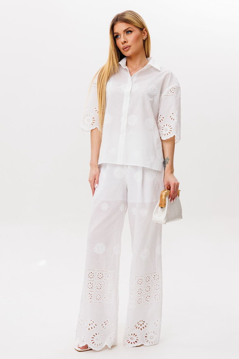 Рубашка свободного силуэта ,с центральной бортовой застежкой на петли пуговицы. Воротник на стойке отложной. Спинка на кокетке, рукав короткий.