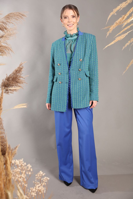Яркий костюм, состоящий из жакета и брюк. Яркий удлинённый жакет поможет украсить любой повседневный или же праздничный образ! Классический двубортный жакет без лацканов и воротника из мягкого твида, среднего объема, полуприталенного силуэта. Застёжка на 2 пуговицы. По уровню талии - имитация карманов с клапанами. Брюки умеренного объема, прямого силуэта. На передних половинках брюк заутюжены стрелки, переходящие в складки по линии талии. На задних половинках также заутюжены стрелки. В боковых швах расположены карманы. Застежка-гульфик. Пояс отрезной, притачной. В задней части пояса вставлена эластичная тесьма (резинка). На пояс настрочены шлевки. Выступающая часть пояса застегивается на петлю и крючок. Ремень не входит в комплект. Фурнитура и материалы отделки могут незначительно отличаться от тех, что на фотографии.