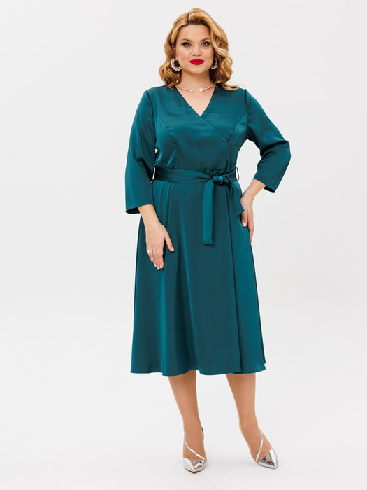 Нарядное платье из атласной струящейся ткани, платье отрезное по линии талии, нижняя часть платья расширенная, в боковом шве расположена потайная молния.  Лиф платья имитирует платье на запах, по груди расположены рельефные швы. Рукава ниже локтя. Платье дополнено съёмным поясом из основной ткани.