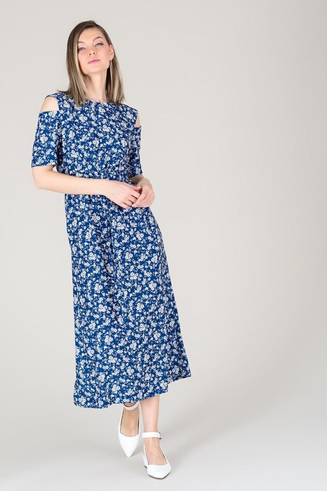 Платье из плательной ткани полуприлегающего силуэта. По спинке изделия выполнена застёжка на пуговицу, снизу-разрез. Короткий рукав оригинального кроя. Круглый вырез горловины окантован косой бейкой из основной ткани. В комплекте пояс, позволяющий создавать приталенный силуэт.