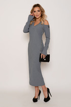Платье женское нарядно-повседневное прилегающего силуэта выполнено из трикотажного полотна двух расцветок. Вырез горловины круглый на обтачке, рукав втачной. Центральная часть полочки фугурная из отделочной ткани. По линии талии вставка из ткани в виде пояса. В боковых швах обработаны разрезы. Спинка с центральным швом и потайной тесьмой молнией. Декором служит нашивка по центральной части полочки.