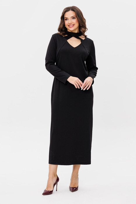 Таинственность великолепного чёрного платья не останется не замеченной. Она элегантно  и лаконично, однако оригинальное исполнение  выреза горловины со сложным геометрическим решением, делает образ очень эффектным. Полуприлегающий силуэт, втачной покрой. Полочка с рельефом, переходящим в вырез горловины. Спинка с центральным швом, разрезом и молнией, цельнокроённой стойкой и талиевой вытачкой.