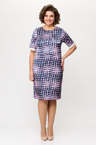 Платье женское прямого силуэта, зауженное к низу, отрезное по талии, с  округлым вырезом горловины и втачными рукавами. Полочка оформлена застроченым складками и пришивным украшением. Баска и рукава  выполнены из красивого гипюра в цвет основной ткани.