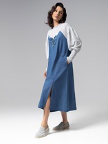 Перёд и спинка с V вырезом. По бокам разрезы. Сарафан на завязках, выполнен из другого цвета ткани.