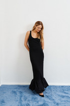 Платье женское отрезное по линии талии, льняное. Перёд с нагрудными вытачками идущими с боковых швов. На верхней части переда расположена декоративная вышивка. Горловина круглой формы. Спинка со средним швом, в которой расположена застёжка горловины на одну пуговицу. Нижняя часть платья собрана на сборку. Рукава одношовные, короткие, гладкие.