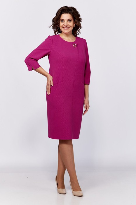Нарядное женское платье из ткани средней плотности с добавлением вискозы. Нарядность платью придает фактура ткани - рубчик по диагонали. Силуэт полуприлегающий, длина чуть ниже колена, вырез горловины круглый с застежкой на потайную молнию по спинке. По переду функциональные карманы в рельефах. По центру переда на уровне груди фигурная отлетная деталь имитирующая застежку с декоративной брошью. По спинке в среднем шве невысокий разрез. Рукав 3/4 с небольшим разрезом по низу.