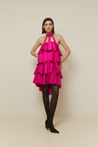 Платье женское А- силуэта. Рукав втачной, двухшовный. По переду отлетная деталь имитирующая «косуху», с декоративной, не функциональной застежкой – молнией. Горловина округлой формы, воротник апаш из отделочной ткани. По линии талии подрез. Нижняя часть платья со сборкой, на подкладке. Выполнена из отделочной ткани с отстрочными швами, накладным карманом с клапаном на две петли и пуговицы. Карман функциональный. Спинка со средним швом, отрезная по линии талии, со сборкой из отделочной ткани. В верхней части спинки потайная молния. Длина изделия по спинке 115см. Длина рукава 52см.