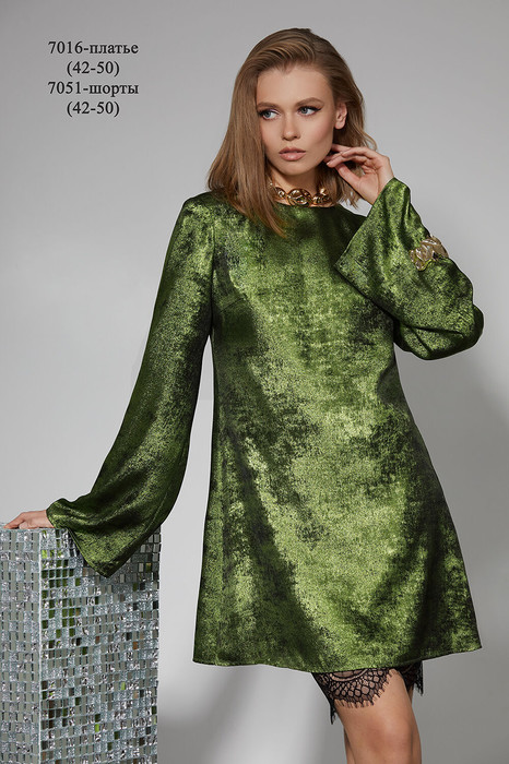 Стильное платье длиной выше колена, немного расширенное книзу. Свободное в талии и бедрах. Втачной длинный рукав, расширенный книзу. Горловина круглая. Глубокий вырез на спинке, который фиксируется завязками в области лопаток. Платье без подкладки.