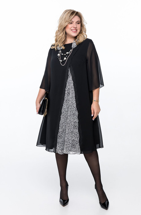 Женское платье активно расширенного к низу силуэта, выполненное из тонкого струящегося однотонного шифона с подкладкой из тонкого трикотажа. По переду платья есть треугольная вставка, выполненная из шифона с дизайном. Также из шифона с дизайном выполнена часть съемных бус, которые служат декором изделия. Горловина округлая. Рукав втачной расширенный. Длина изделия по спинке 107 см. Длина рукава 43 см.