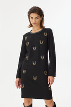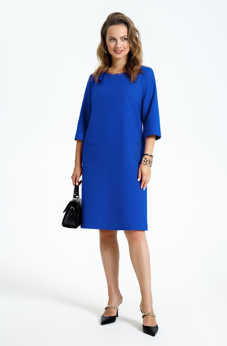 Платье прямого силуэта из текстиля. С втачным рукавом, по переду нагрудные выточки, прорезные карманы с наклонными листочками. Застежка на потайную молнию в среднем шве спинки. Платье без подкладки.