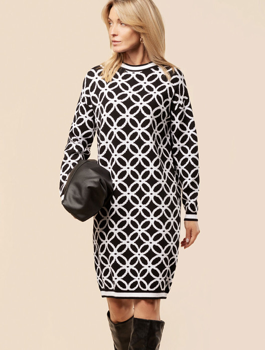 Платье двуслойной жаккардовой вязки выполнено из мягкой пряжи на основе вискозы с добавлением кашемира. Модель свободного силуэта подходит для любой фигуры. Нежная пряжа очень комфортно ощущается на теле, сохраняя оптимальное тепло при этом не перегревая. Совет стилиста: жаккардовое платье отличная инвестиция в базовый гардероб, которая поможет создать дорогие образы. Носите с высокими сапогами удлиняя силуэт или плотными колготками.