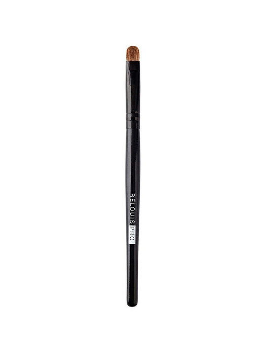 Плоская кисть позволяет детально проработать тенями поверхность подвижного века, выделить компактным хайлайтером Relouis PRO подбровное пространство и создать блик во внутреннем уголке глаза.