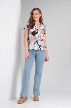 Рубашка укороченная, свободного силуэта,с центральной бортовой застежкой на петли пуговицы. Воротник на стойке отложной, рукав короткий.