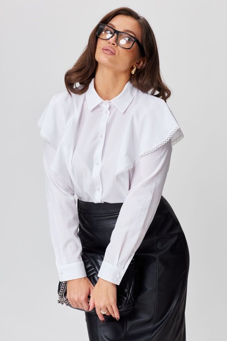 Блузка женская прямого силуэта. Перед и спинка с вертикальными подрезами и воланом, отделанным кружевом. Застёжка спереди на петли и пуговицы. Рукав втачной одношовный со складками по низу, на притачном манжете. Воротник рубашечный на стойке