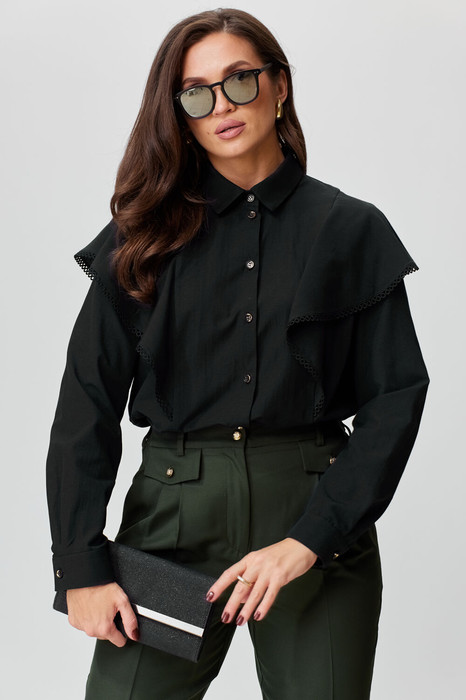 Блузка женская прямого силуэта. Перед и спинка с вертикальными подрезами и воланом, отделанным кружевом. Застёжка спереди на петли и пуговицы. Рукав втачной одношовный со складками по низу, на притачном манжете. Воротник рубашечный на стойке