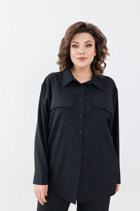 Рубашка прямая, с разрезами по боковым швам, длиной до бедра. Рукав длинный, с манжетами. Классический рубашечный воротник, застежка по переду на петли пуговицы. По переду нагрудные карманы.