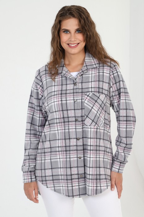 Рубашка (туника) женская из трикотажного полотна «флис» с рисунком в клетку, прямого силуэта, с длинными втачными рукавами на притачных манжетах, стояче-отложным воротником, нагрудным карманом, фигурным низом и центральной бортовой застежкой на петли и пуговицы. Спинка – с отрезной кокеткой и бантовой складкой в центре соединительного шва.